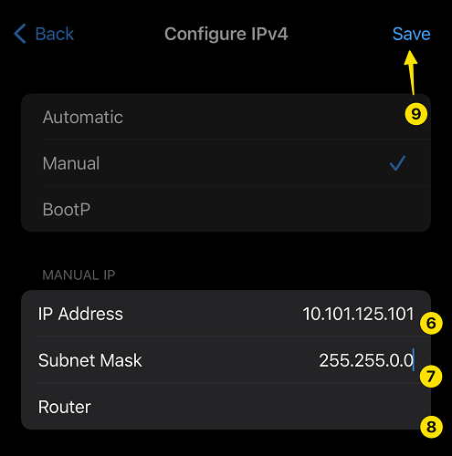 10.101.125.xxx, but you can check the IP address of your lighting or sound console, and set the IP to be in the same range - the first two sets of numbers should be the same, and the third set of numbers will typically be125.)-